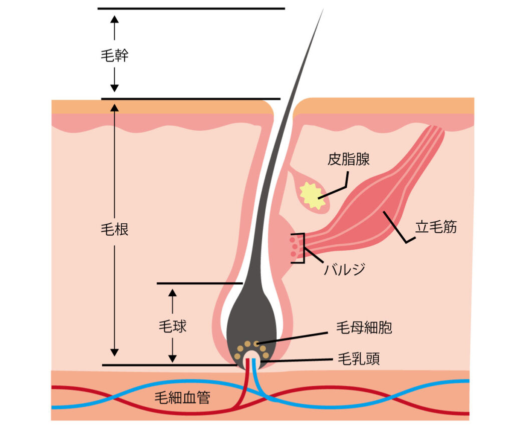 下のイラストにある下の方の、毛乳頭というところに毛髪に色を付けるメラノサイトという色素細胞があります。